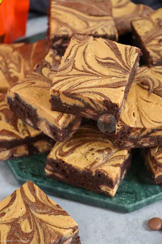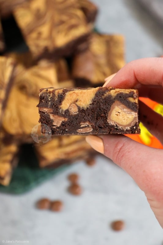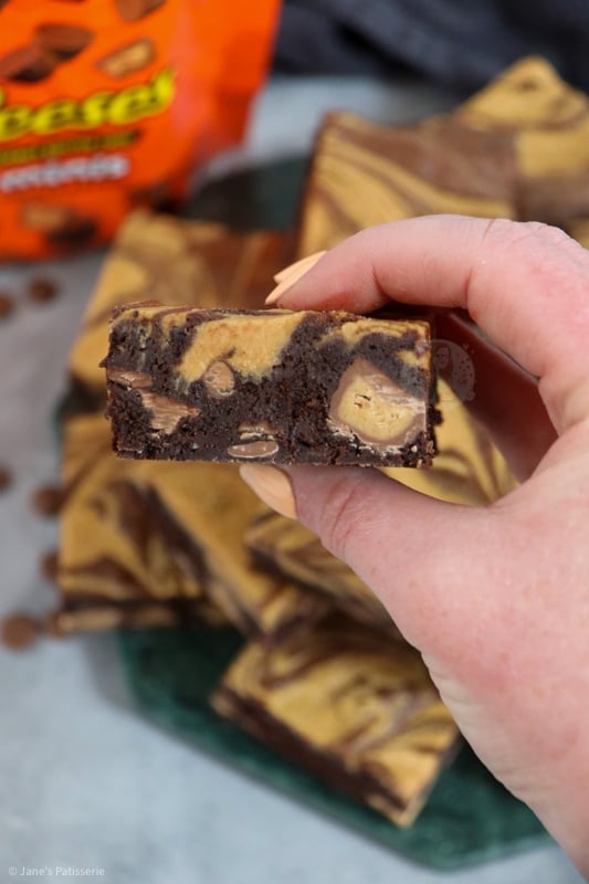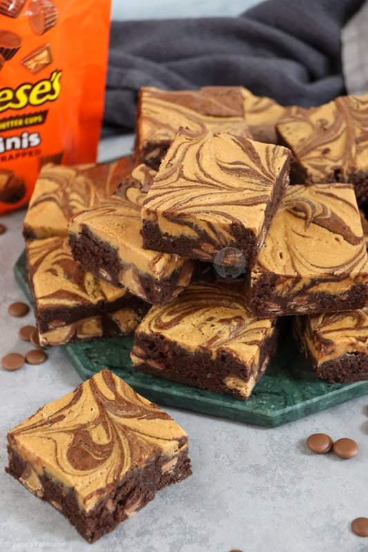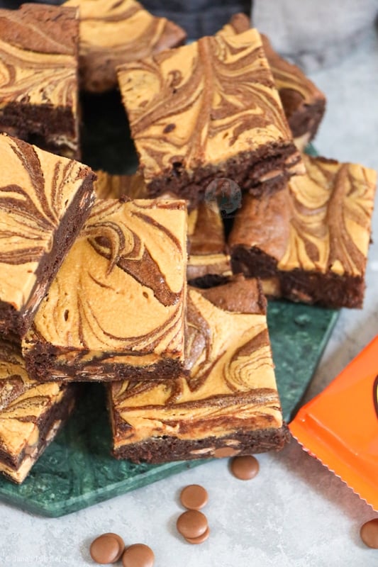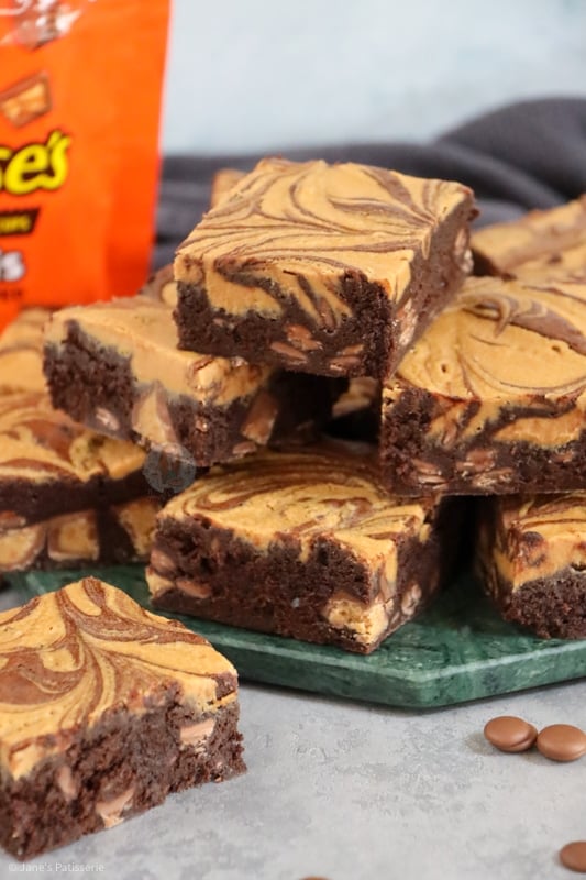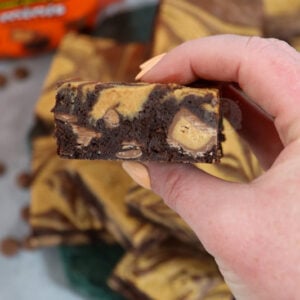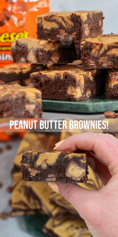 Super chocolatey peanut butter brownies with a peanut butter swirl, chocolate chips and peanut butter cups!