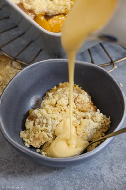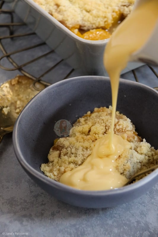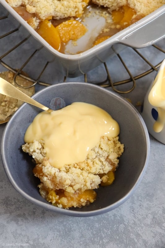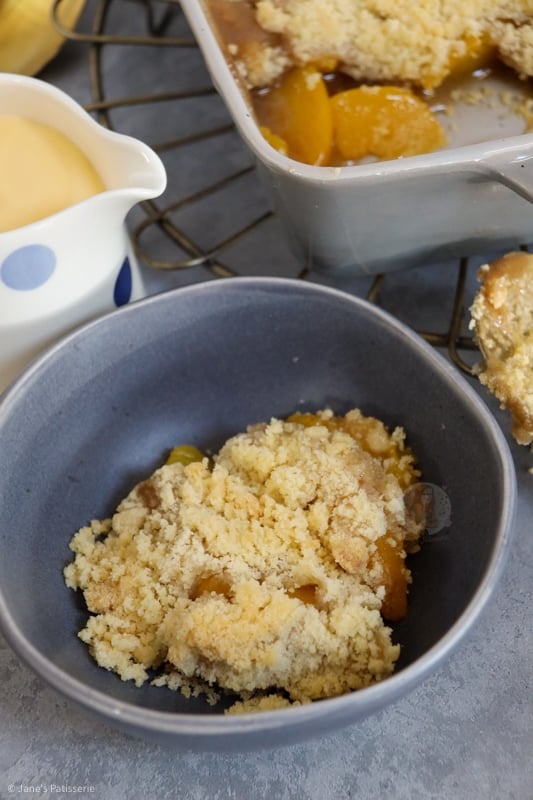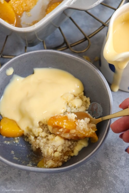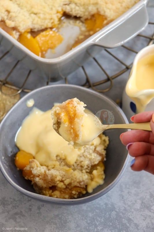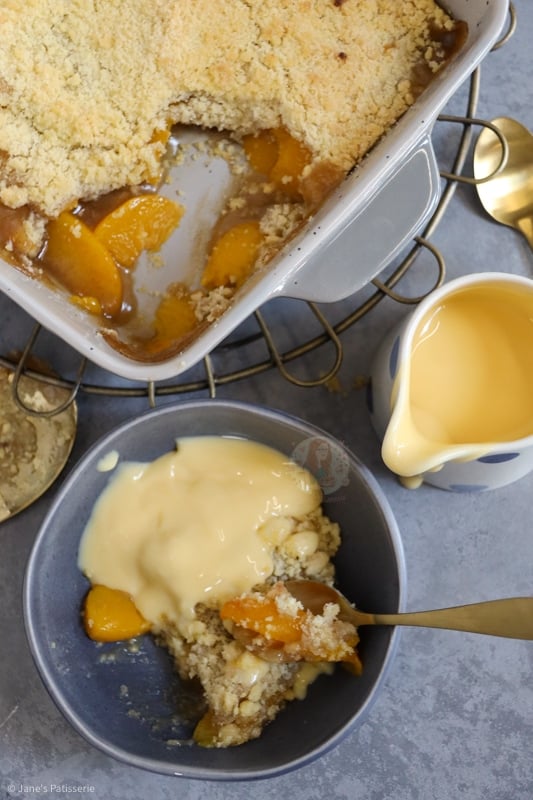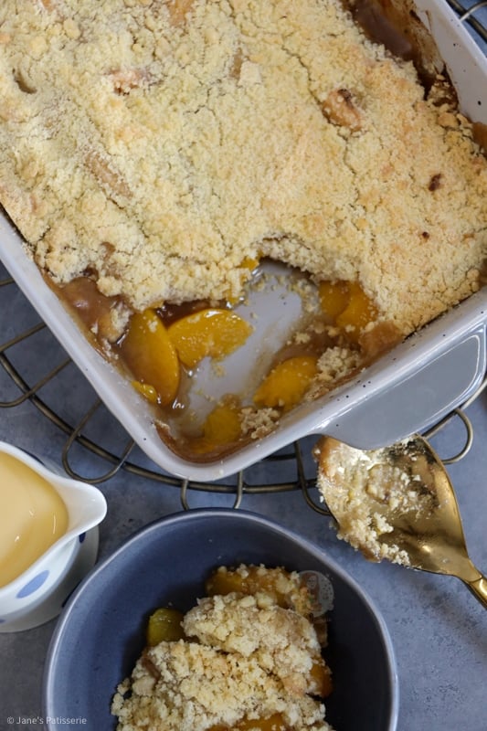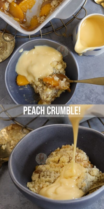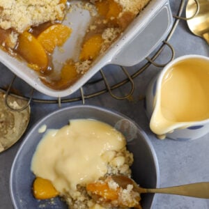 A scrumptious and easy peach crumble with a homemade crumble topping and a cinnamon spiced peach filling, perfect served with custard!