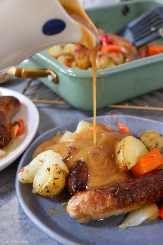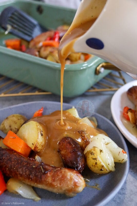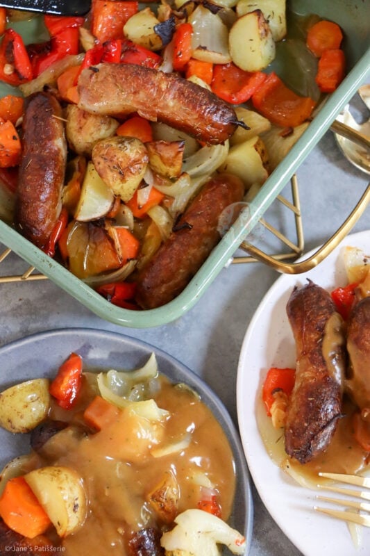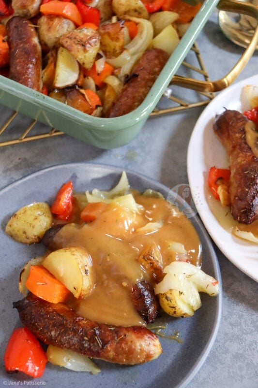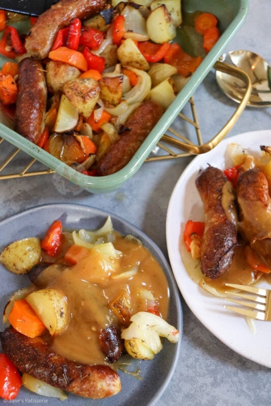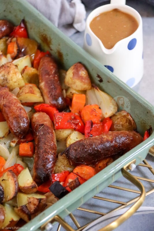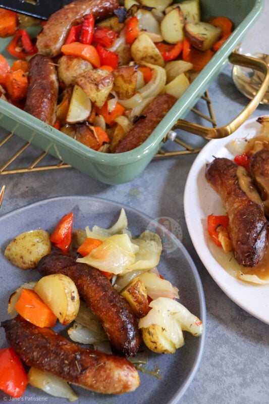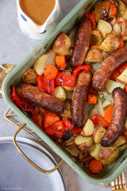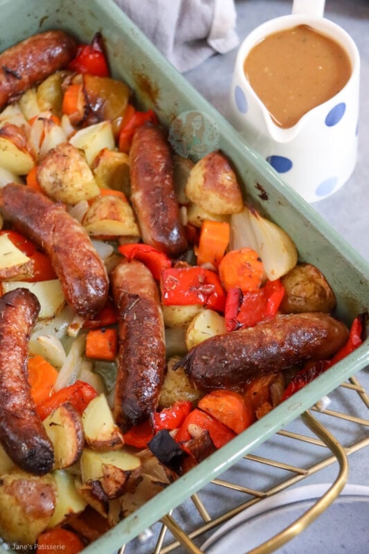 A delicious and easy favourite for so many households, a throw together sausage traybake that’s perfect for dinner!