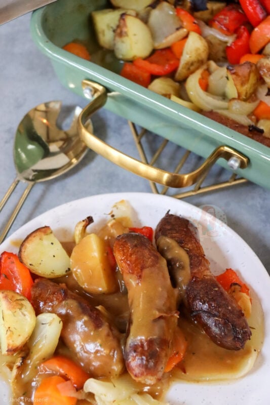 I’ve made this a couple of times now and it is delicious the first time I used frankfurters as that was all I had and just put them in for the final 20 minutes and also put several garlic cloves in their skins to roast alongside the veg
