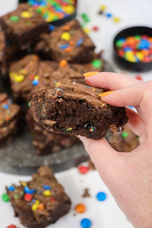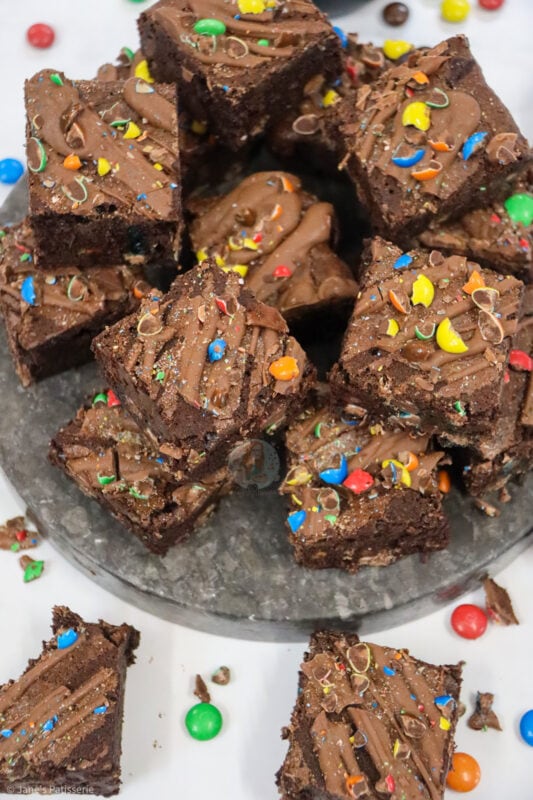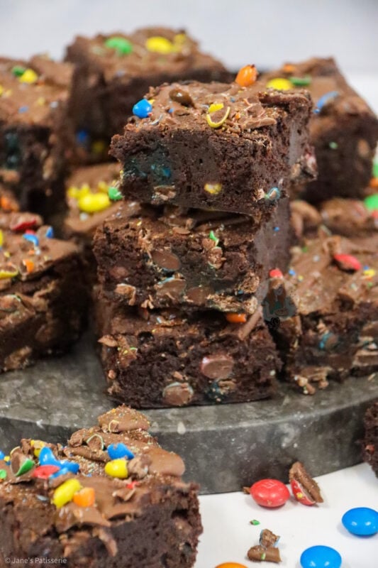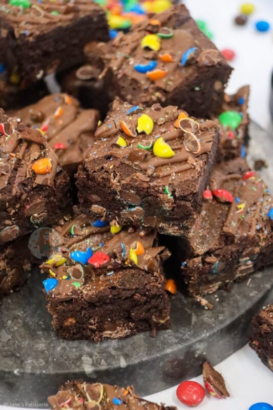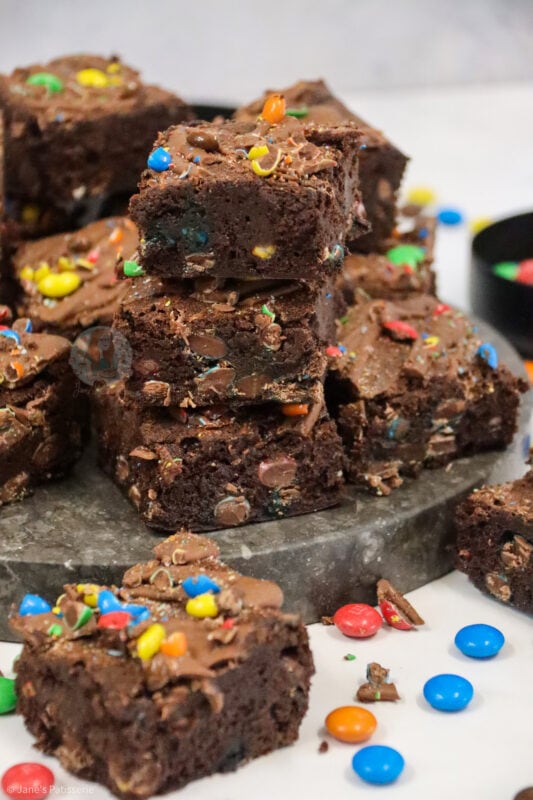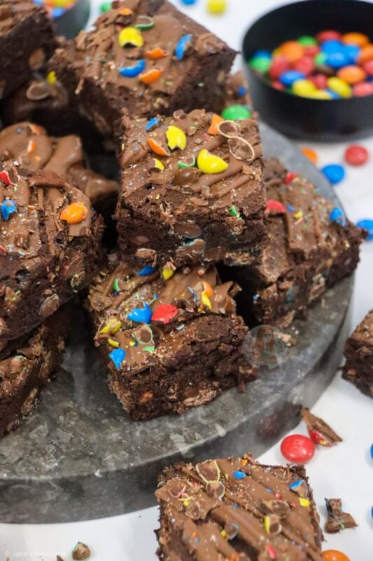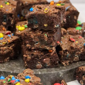 Fudgey and delicious M&M brownies with a delicious chocolate brownie, stuffed full of M&Ms and even more goodness on top!