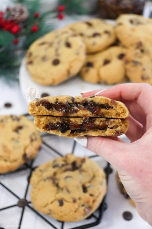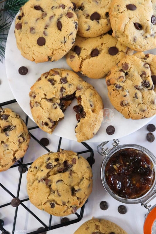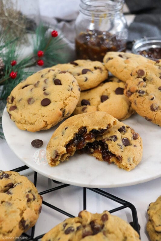 Delicious chocolate chip cookies stuffed with mincemeat to make scrumptious mince pie cookies!