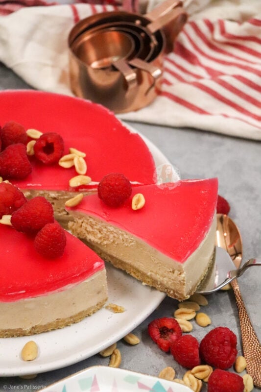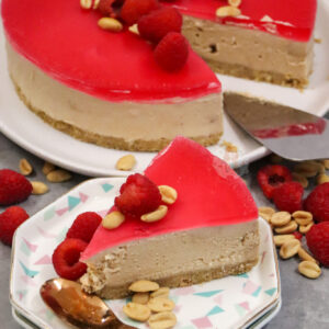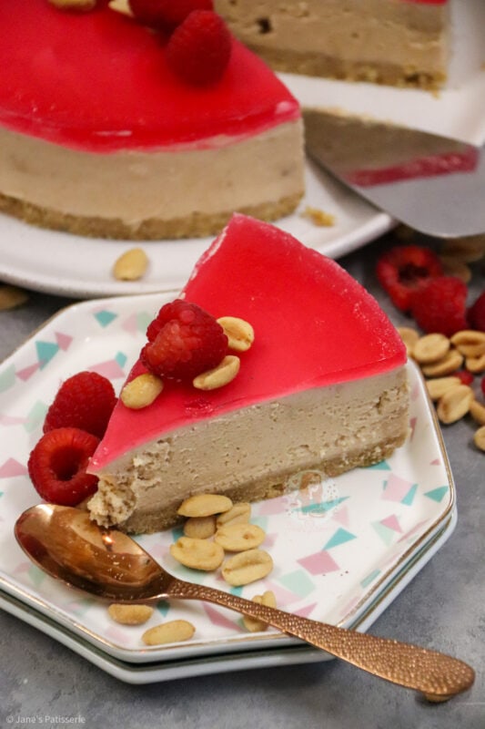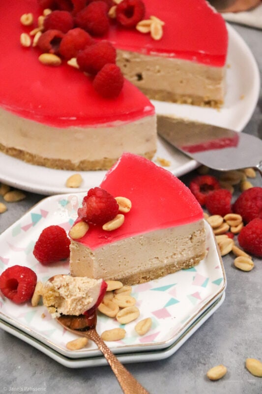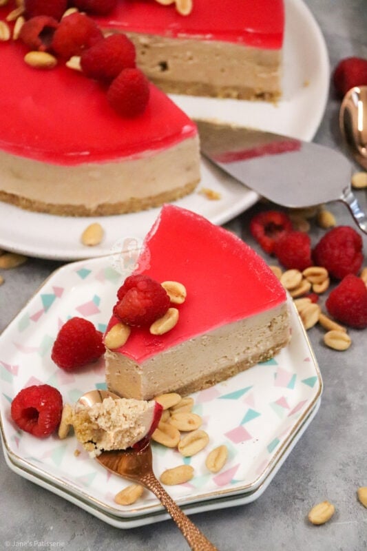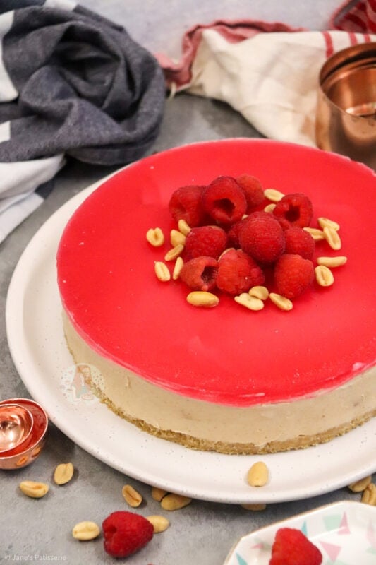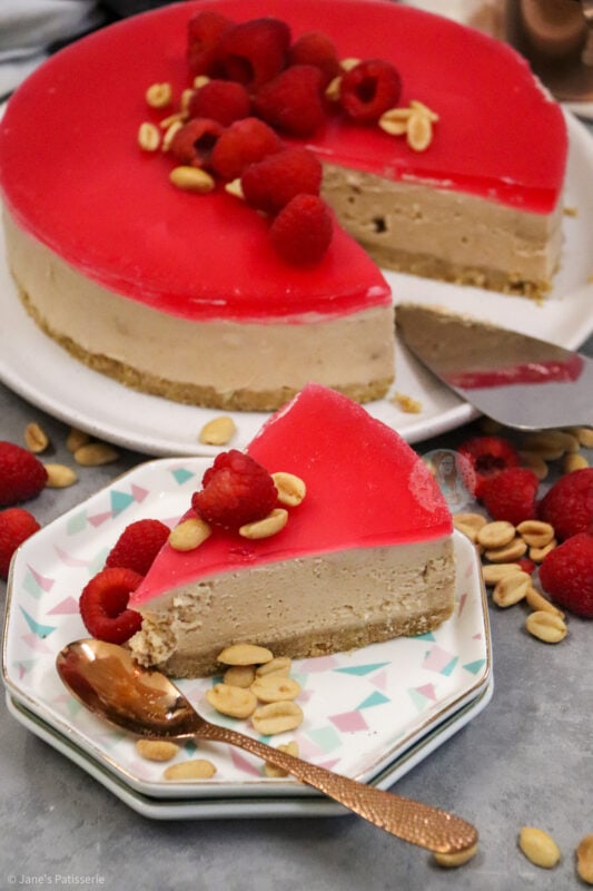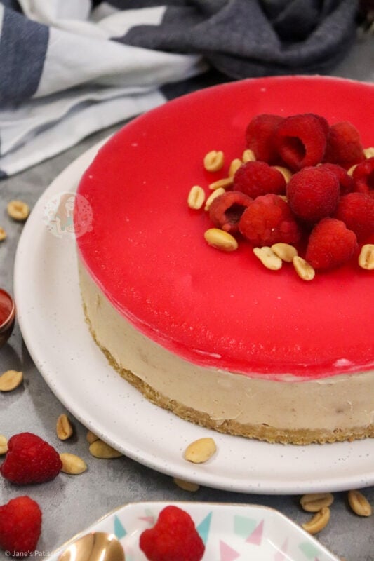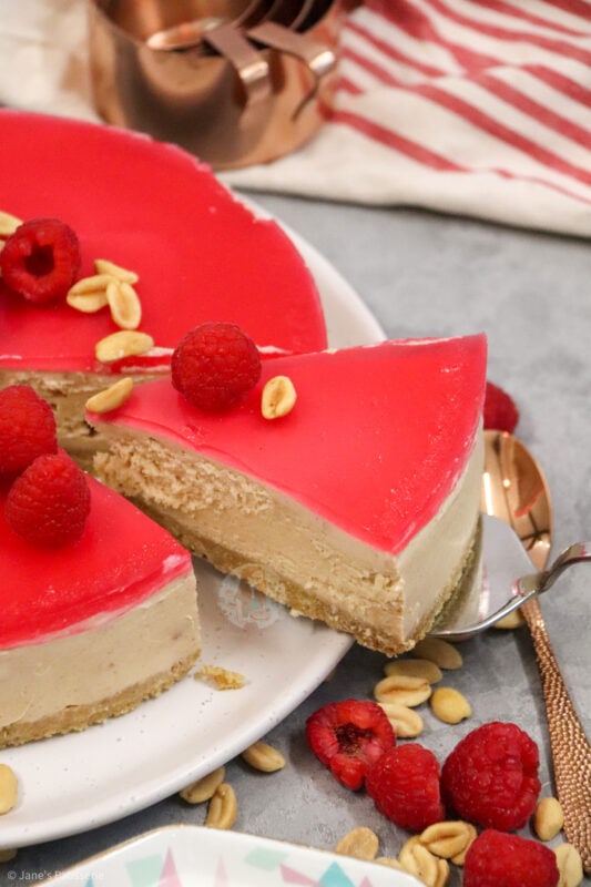 I went for some fresh raspberries and some peanuts just piled slightly in the middle as it gives a bit of a decoration and theme hint to the flavour without too much fuss. You can use plain peanuts, salted peanuts, caramelised peanuts… whichever you prefer for the decoration (and the base of the cheesecake).