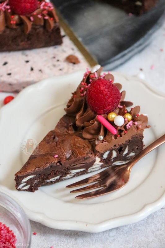 When it came to decorating this brownie, I went relatively simple because I really didn’t know what to choose! In my giant valentines cookie recipe I use a pink buttercream so I didn’t want to do that again. I sort of wanted to really wham the chocolate into this one.