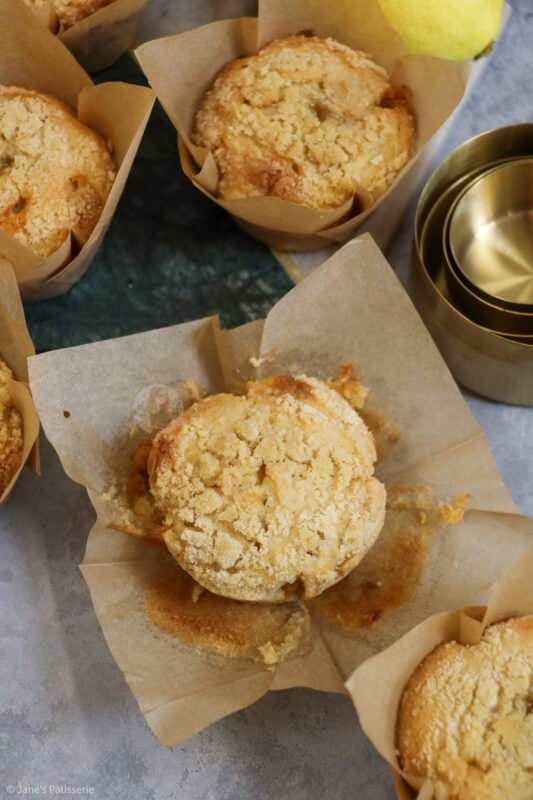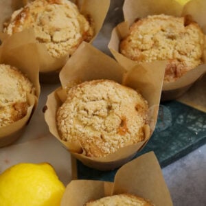 Once the muffins have had the lemon curd inserted in, I sprinkle on the streusel topping and bake the muffins in the oven until golden.