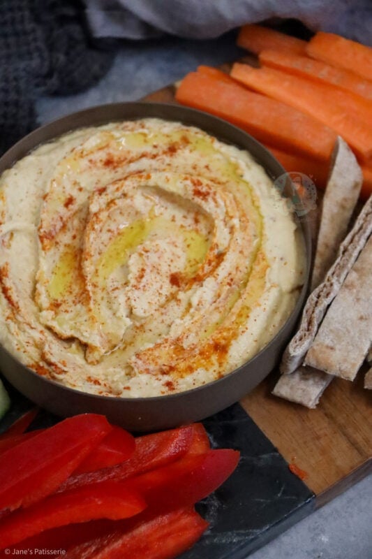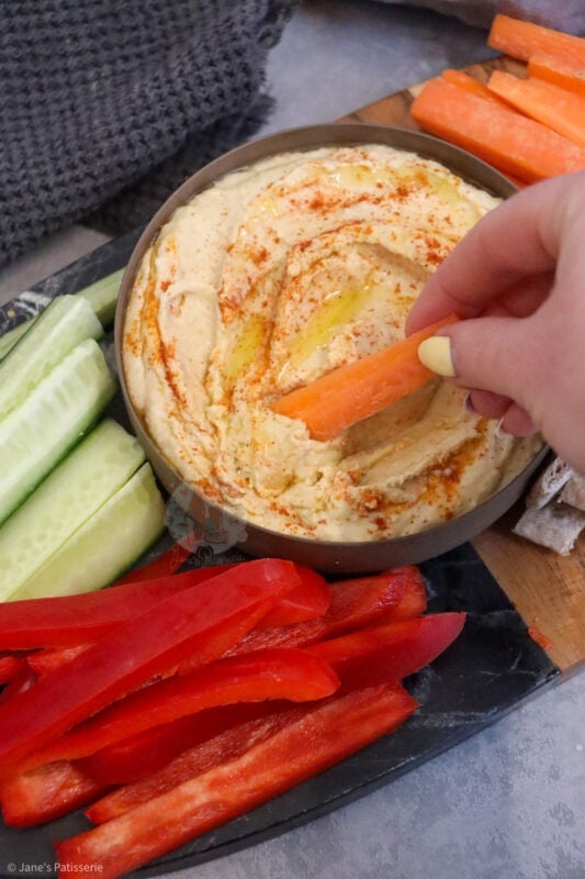 I love to serve mine with some fresh cold vegetables as you can see in the photos, with pitta bread chopped up, with tortilla chips… you can use whatever you want to serve this houmous, it’s entirely up to you.