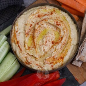 I serve my houmous in a little bowl, and I swirl in an extra small drizzle of olive oil, and I sprinkle on a little paprika, and sometimes sumac as well. I find it adds a nice look to the houmous, as well as a nice little hit of flavour.
