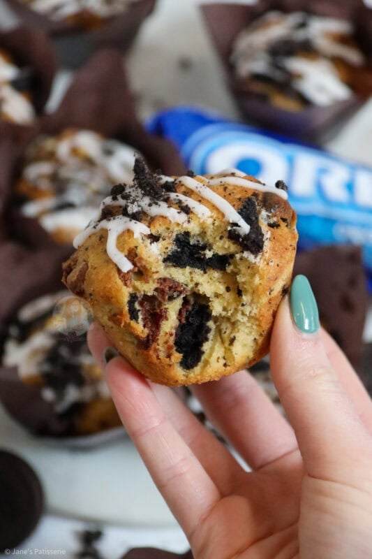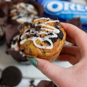 - Oreos – before baking, I sprinkle on some extra oreo chunks just so that they are on top of the muffin and on show as they bake.