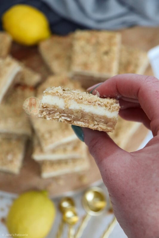 You tip 500g of this mixture into the base of your lined 9×9″ square tin and press down nice and firmly. After this you pour the lemon mixture on top and then sprinkle on the rest of the oat mixture and bake. It turns nice and golden in the oven and then after baking and cooling, the lemon mixture has set perfectly.