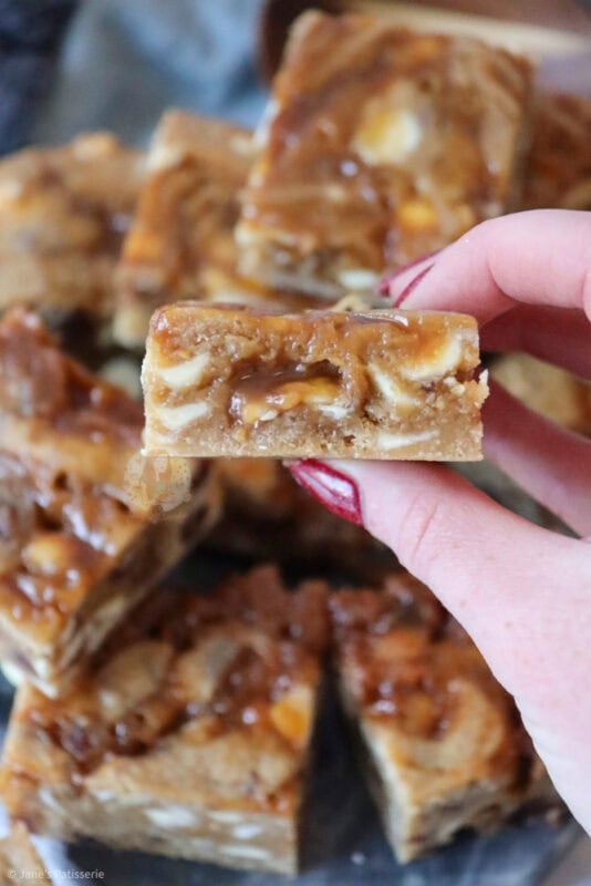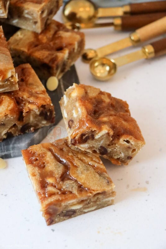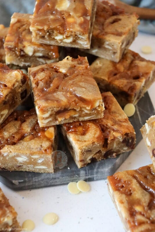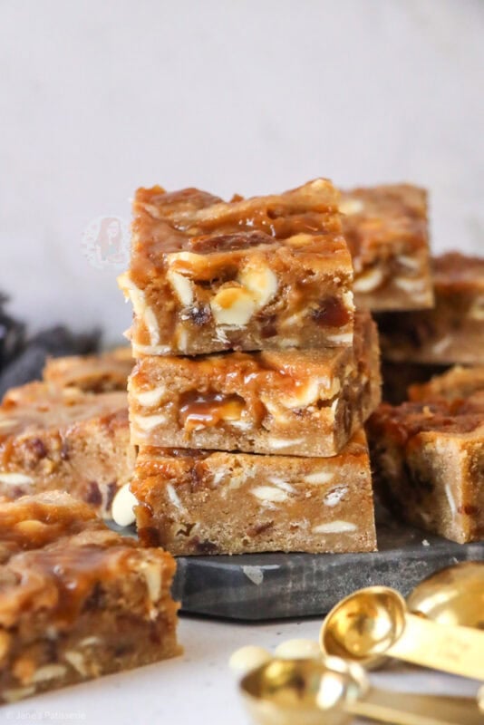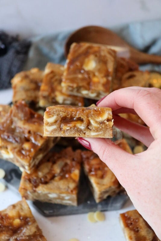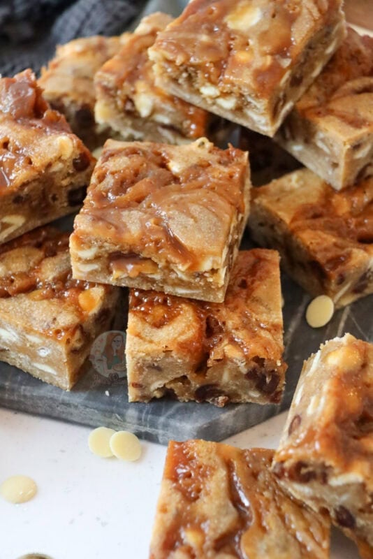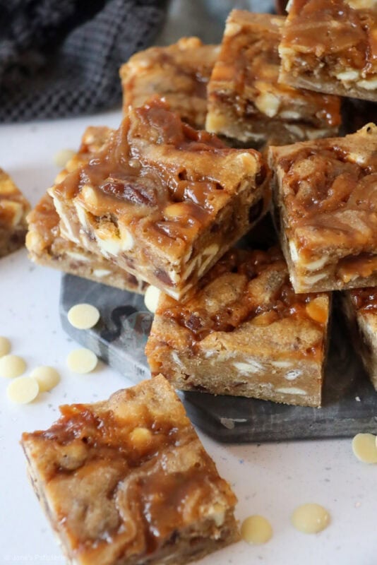 The perfect autumnal traybake of sticky toffee blondies with homemade toffee sauce, and dotted with white chocolate chips and dates