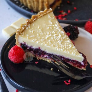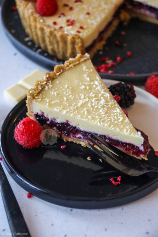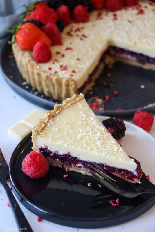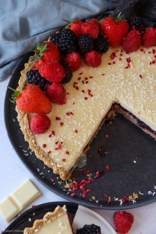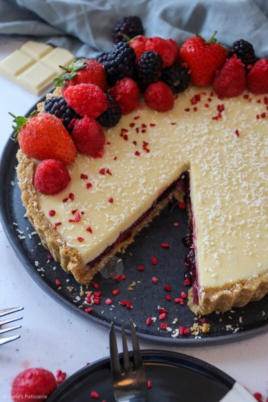 A deliciously sweet and festive white chocolate berry tart with a biscuit base, berry filling, white chocolate ganache and more