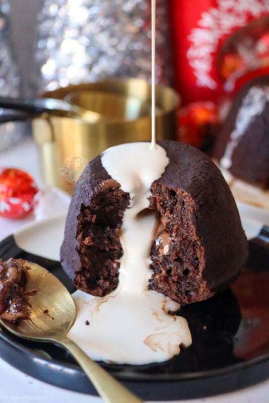 After ten minutes, you are ready for something unimaginably heavenly. I tip my moulds onto my serving plate as they are quite delicate when still warm (as you want them to be). Cut into the pudding to get a centre of soft fondant as well as a melted Lindt ball?! It’s such a good mix.