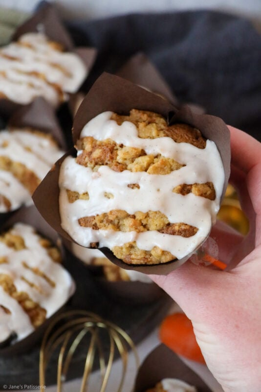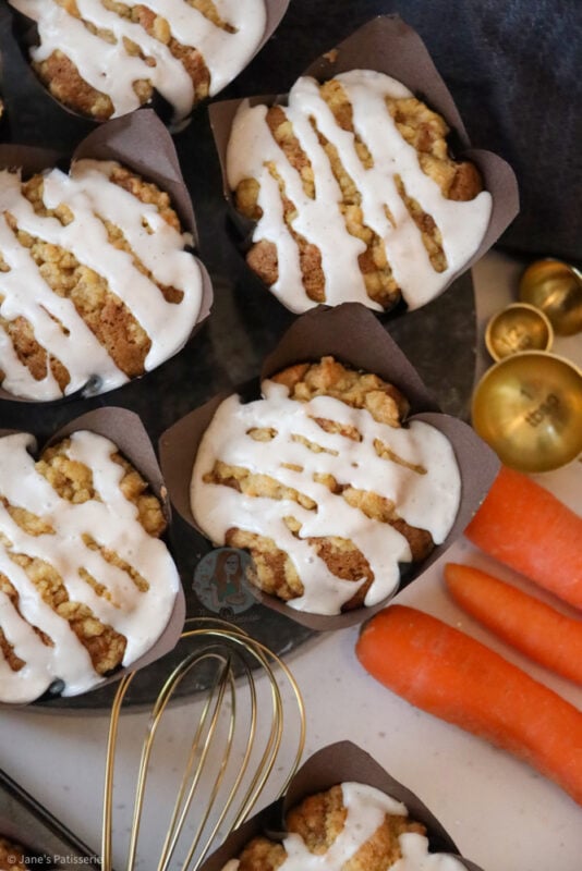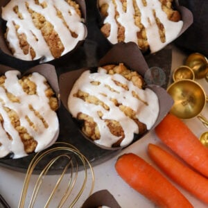 A delicious and incredibly easy carrot cake muffin recipe with a crumb topping, soft and moist muffin, and a cinnamon icing drizzle