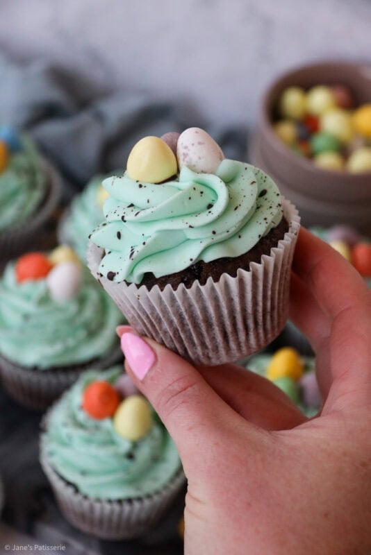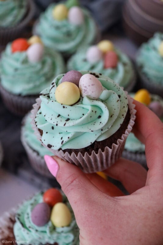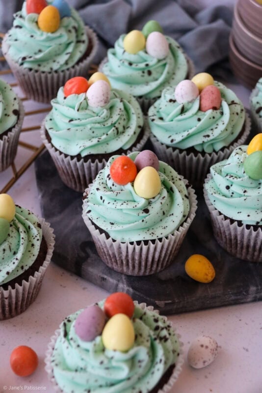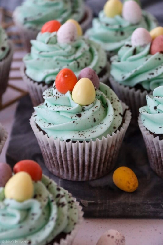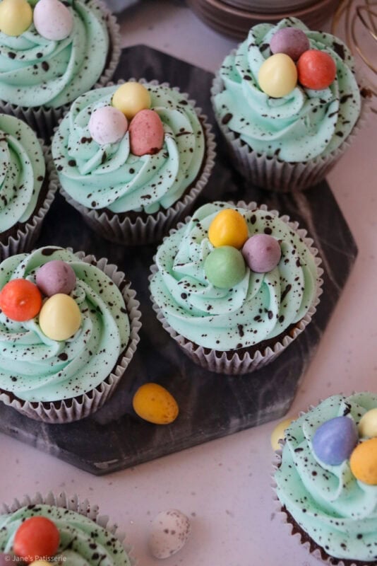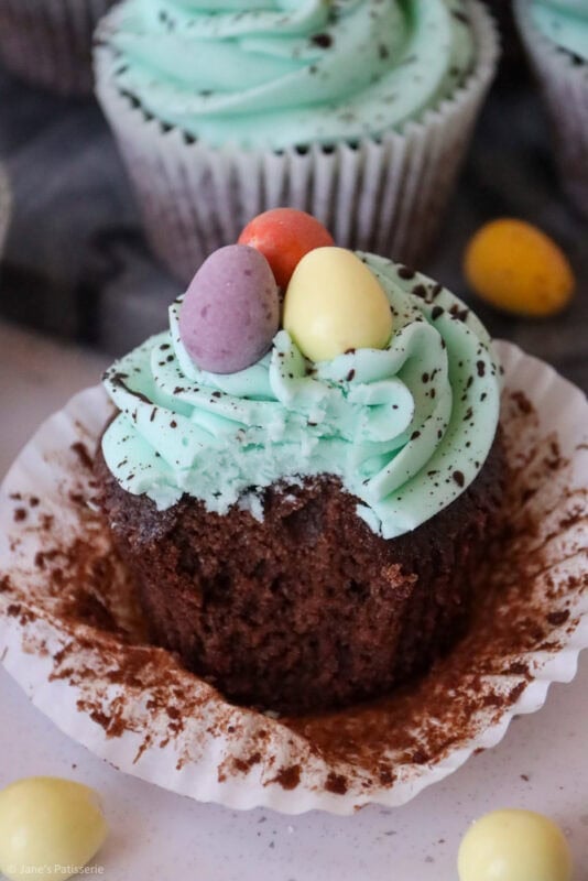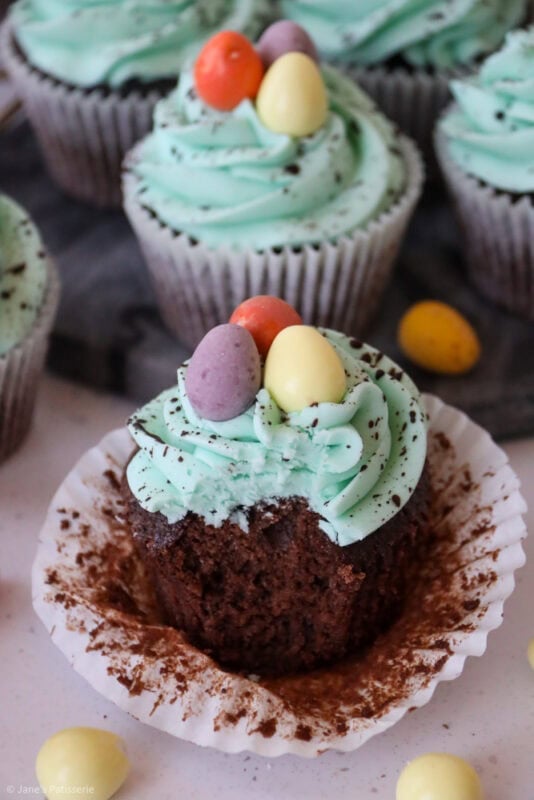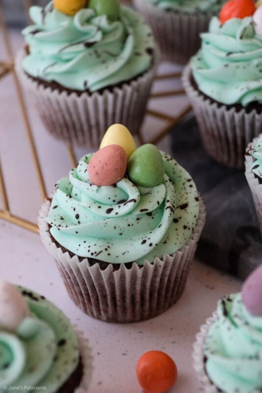 Chocolate and vanilla Easter speckle cupcakes with a chocolate sponge, and vanilla buttercream frosting with a chocolate speckle!