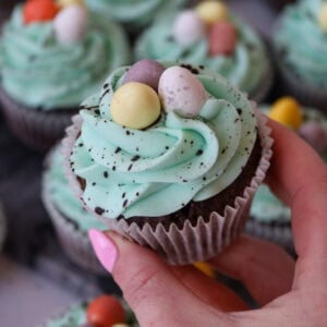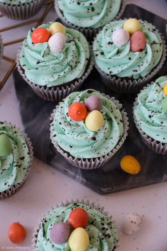 The speckle itself consists of a mix of cocoa powder and water. You want to really mix it together to quite a runny but thick mixture. You can practice how well the mix flecks into the sink or similar to work out if you need to add any more water or not. I use a pastry brush and my finger to flick it all over. Then, I top the cupcakes with some easter chocolates – but this is optional.