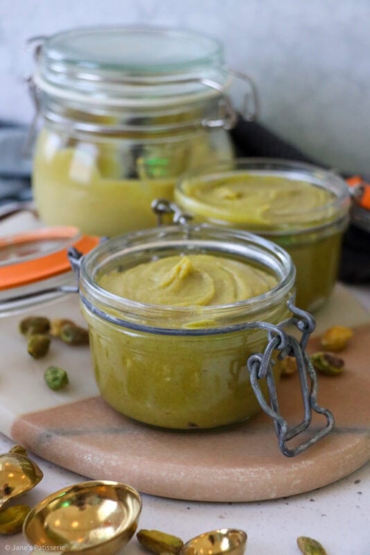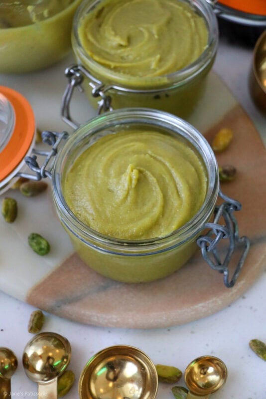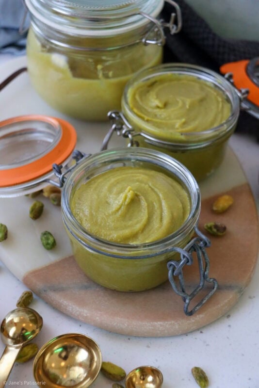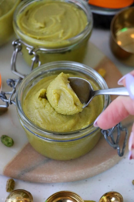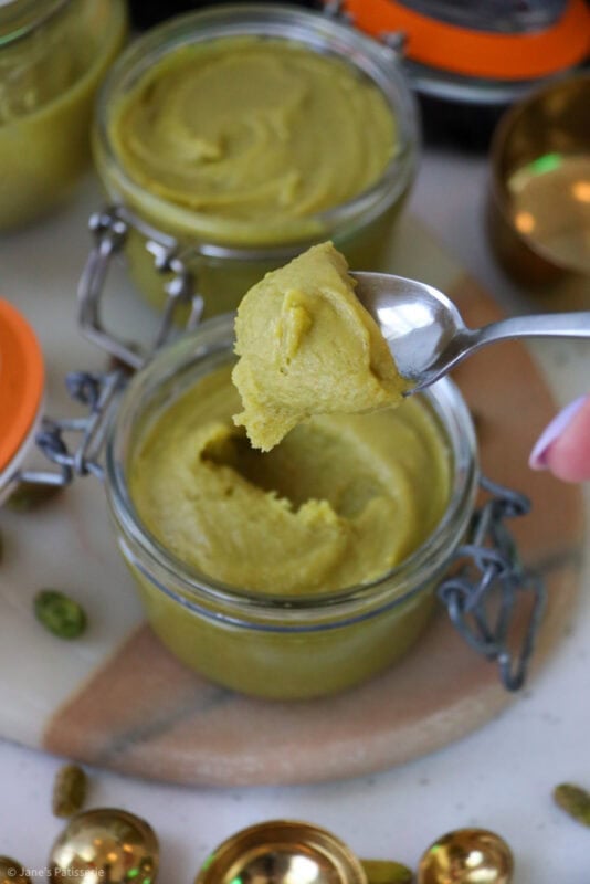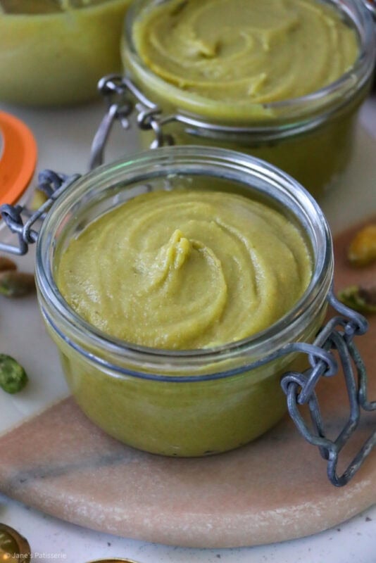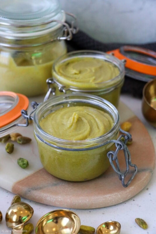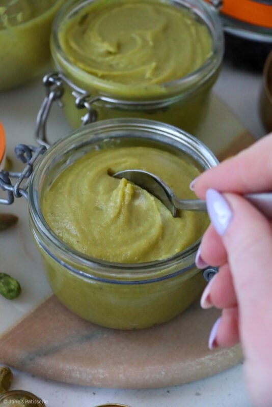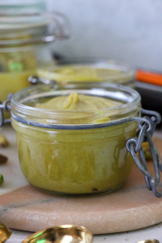 Pistachio cream often has a few more ingredients in it, and it’s a runnier consistency usually – this is also delicious (And you can achieve one from this recipe easily – notes below) but often this has a crossover with a ‘spread’. It’s a classic situation, where different places in the world have a different name for the same thing.