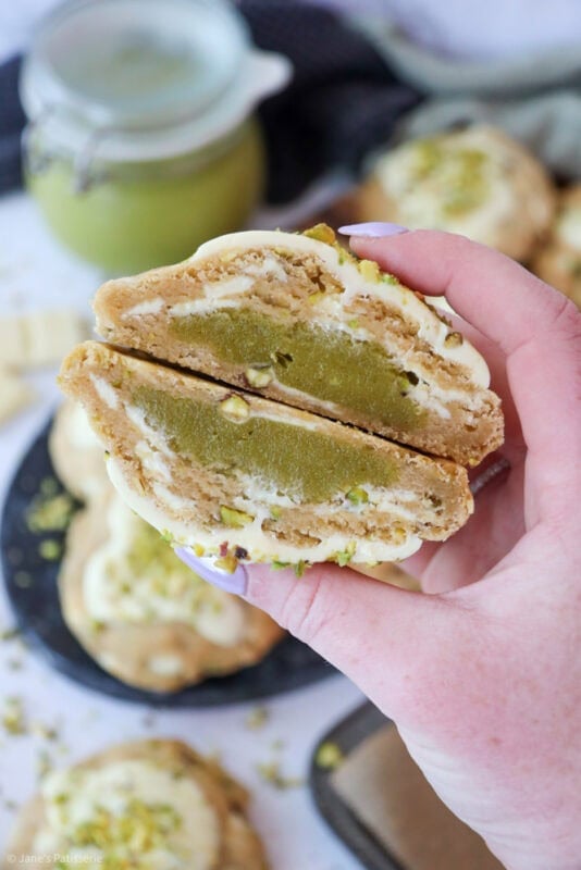 You don’t have to use a pistachio spread inside either – you can leave this out and just make 8 cookies out of the batch, and bake for the same time. You can also use this recipe as a base for other flavours such as hazelnut.