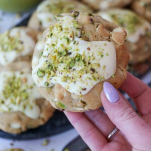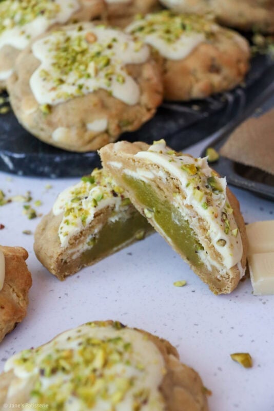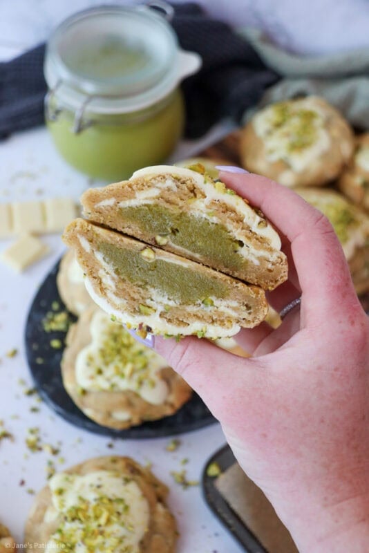 Thick and delicious pistachio NYC cookies stuffed with a homemade pistachio spread, dotted with white chocolate and chunks of pistachio.