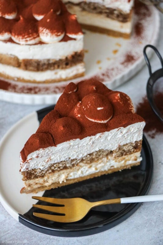 And for the iconic look, I add a little dusting of cocoa powder to the top of the cheesecake – for flavour, for decoration, for deliciousness. It’s a simple yet affective way of decorating a tiramisu cheesecake.
