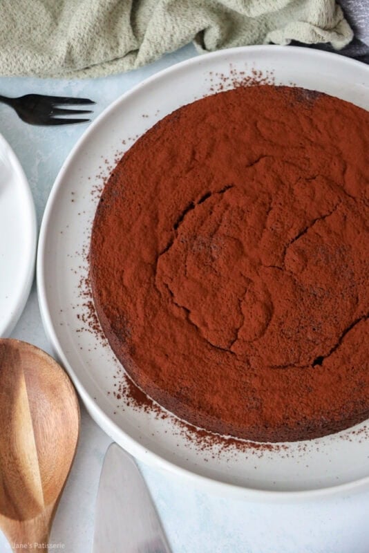 When you have such a luxurious bake like this, sometimes it’s best to stick to simplicity when it comes to the decoration, so I like to do a. dusting of cocoa powder to just intensify the chocolate even ore than the bake already has. However, you can use a dusting of icing sugar instead for something sweet, or even make a simple ganache.