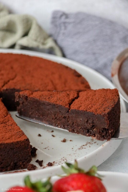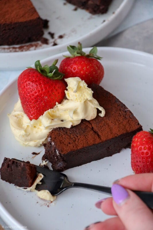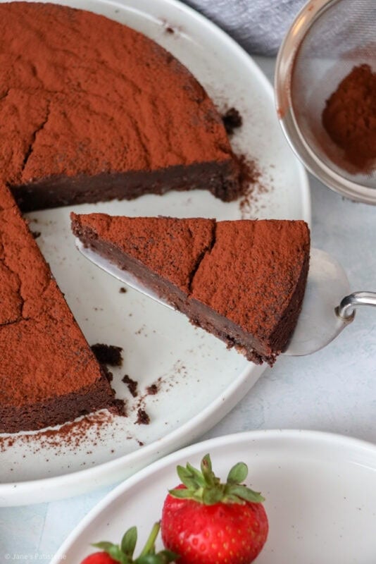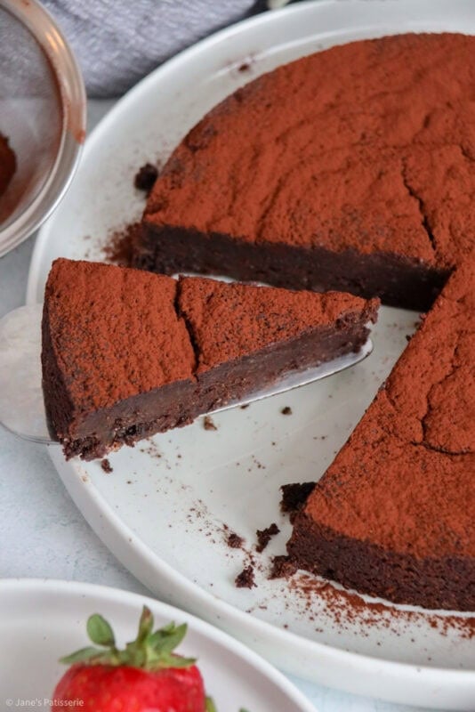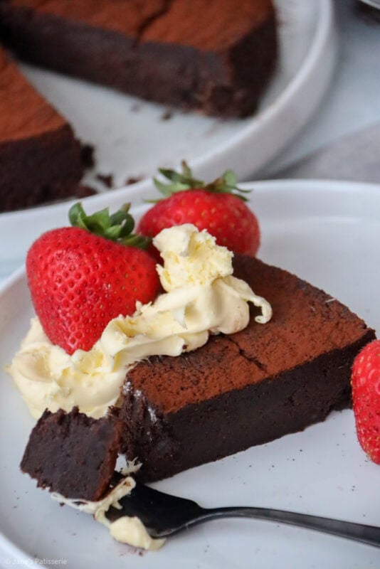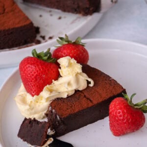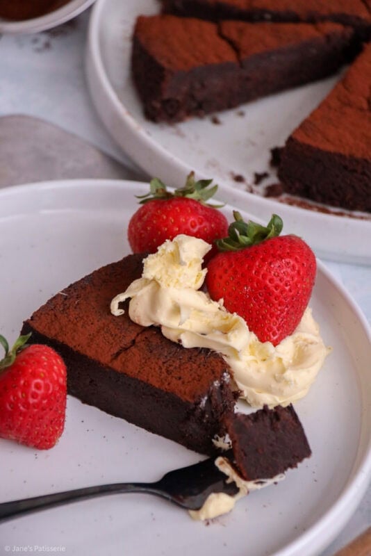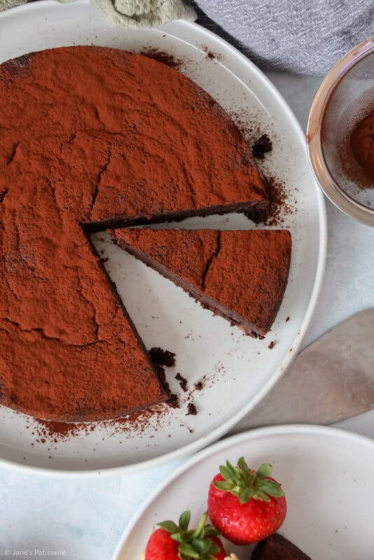 A wonderfully rich and chocolatey flourless chocolate cake that’s perfect for dessert with fruit and a dollop of cream