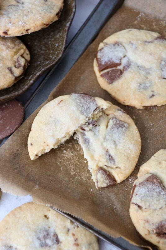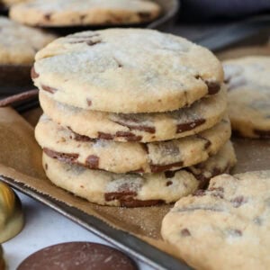 Simple six ingredient chocolate button studded shortbread cookies that are a delicious dupe of the Marks & Spencers viral bake.