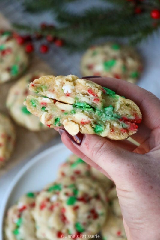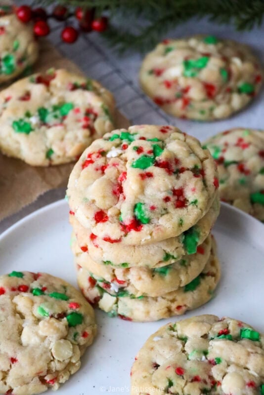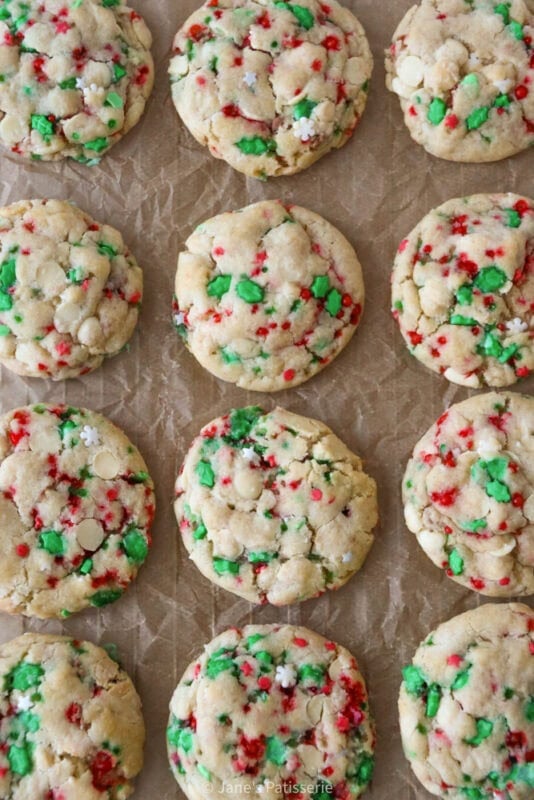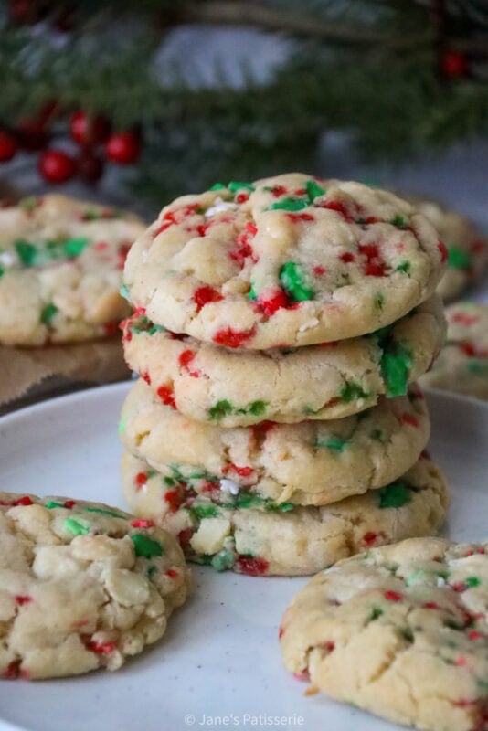 I used a real mix of sprinkles in my cookies as last year I thought it was a smart idea to make one giant pot after Christmas had finished, but these sprinkles are all good ones to use. Generally, because the cookies don’t bake for too long or at too high a temperature, most sprinkles should work (but cheap supermarket ones likely will not)