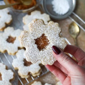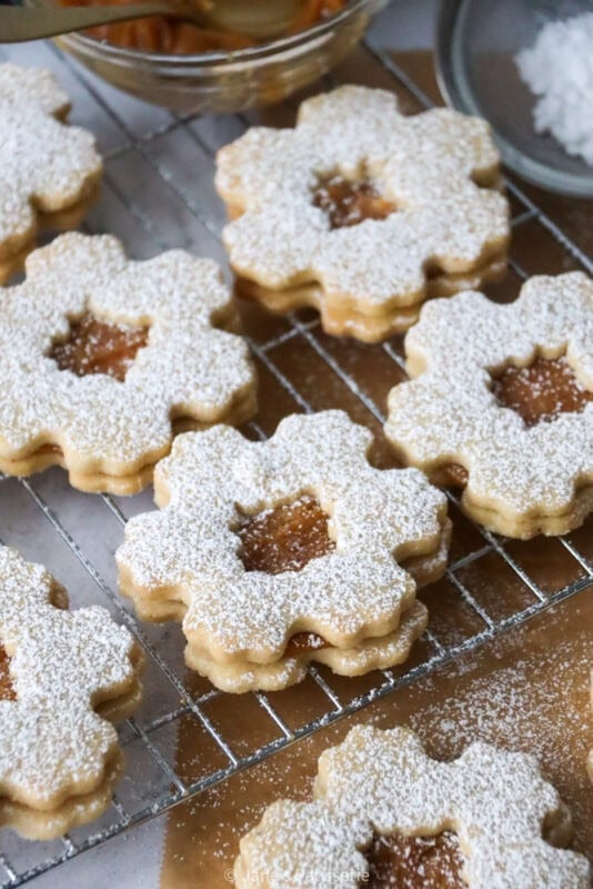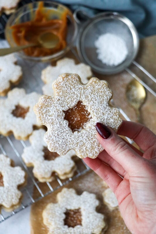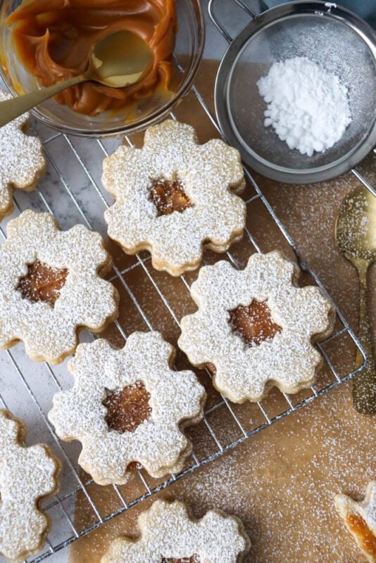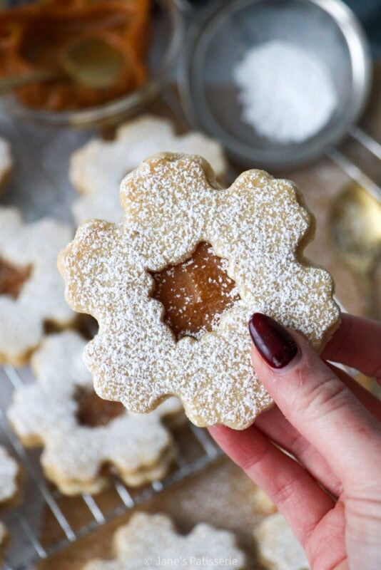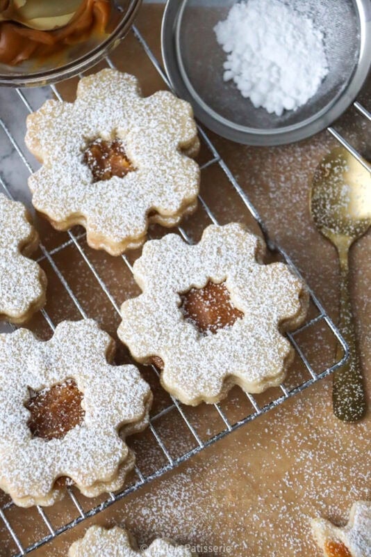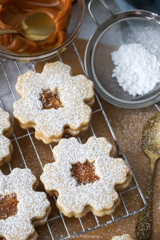 I lay the biscuits without the holes on a tray, and then dollop a spoonful of my homemade caramel sauce on top and spread slightly to the edges of the biscuits. You can then add the biscuit with the centre cut out on top of this, and carefully sandwich the cookies together. I finish the cookies off with a dusting of icing sugar as I like the extra sweetness, and I think it makes them look a little snowy.