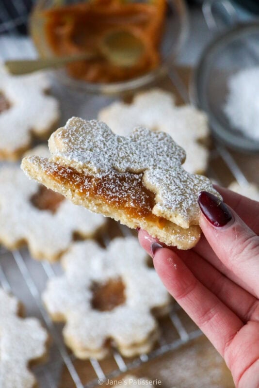 You can also swap up the flavours of these festive sandwich cookies really easily, by using a different centre to your biscuits. I use my homemade caramel sauce like I have said, but you can swap this to a jam or a spread, such as a chocolate spread, or biscoff, or anything similar. As long as it’s not too runny, you can use it.