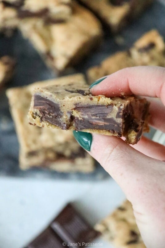 Fold through the chocolate chips of choice, and then press into the base of a lined 9” square baking tin. I always use a 9” square tin for a traybake like this because it makes the perfect sized bar and depth of bar too.