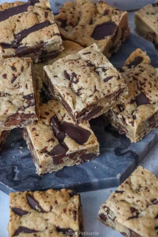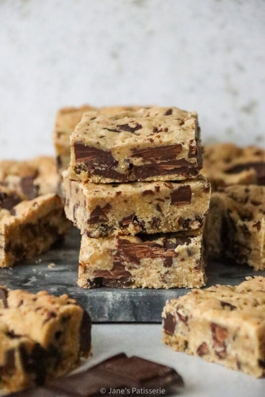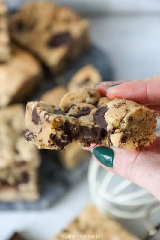 Soft and chewy brown butter cookie bars, stuffed with chocolate chunks throughout, they’re gooey and heavenly in every bite.