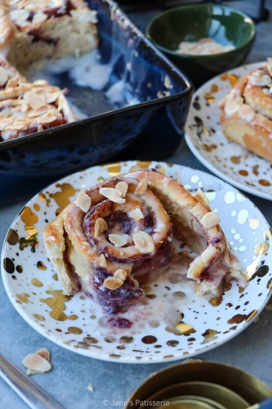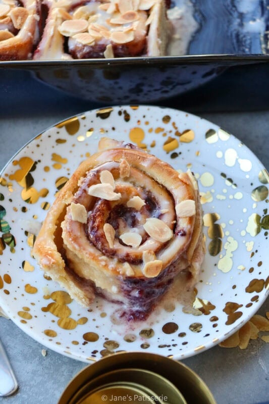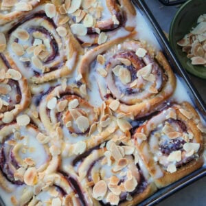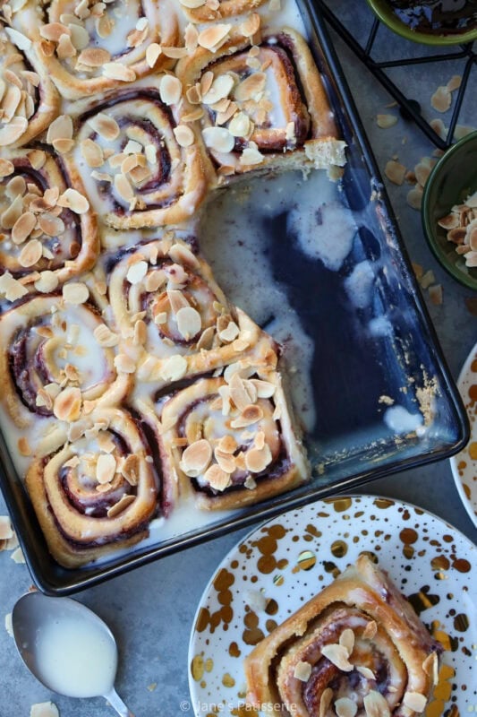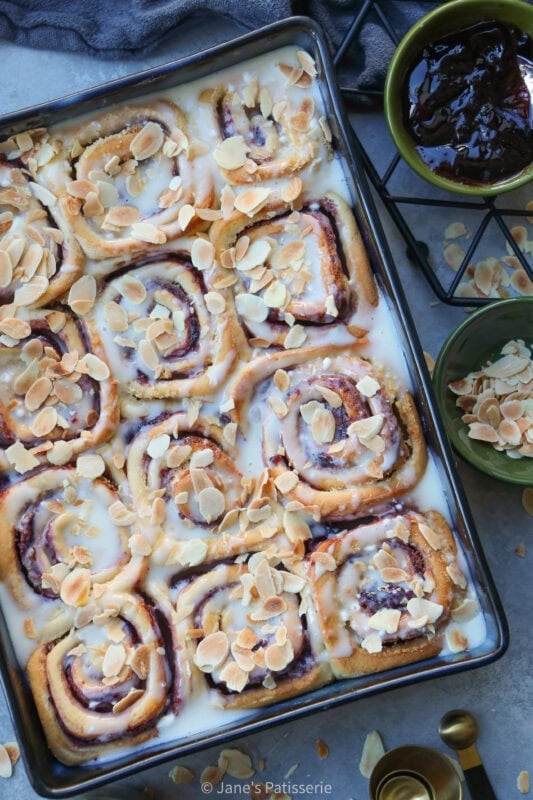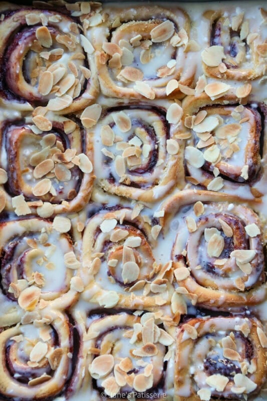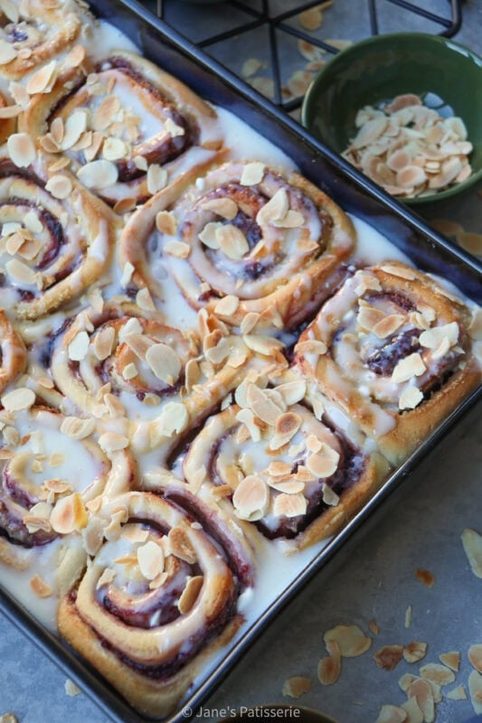 A mixture of cream cheese, milk, almond extract and icing sugar makes a thin glaze that you can drizzle over the rolls. You could make a cream cheese frosting instead if you wanted something thicker, or even just use an icing sugar drizzle. A sprinkle of toasted almonds (add dry plain almonds to a large pan, and heat to a medium heat – move them around and stir them until they turn golden). Sprinkle over the baked and drizzled buns and enjoy.