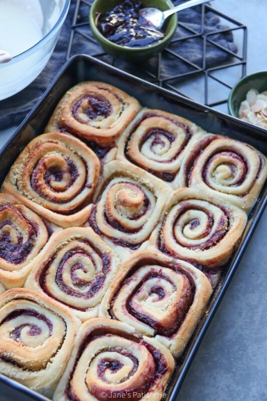 Easy, sweet, soft and delicious homemade bakewell rolls with an almond flavoured dough and filling, and cream cheese glaze.