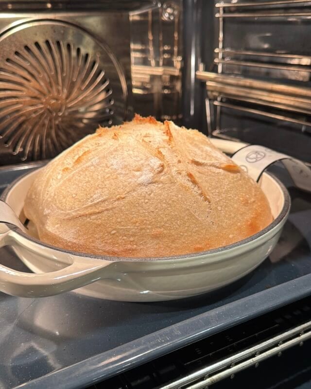 Bake the bread, in the dutch oven, for 30 minutes at 230°c with the lid on (I like to add a few ice cubes into the pot for steam). Then, I remove the lid, lower the temperature to 215°c, and bake for 10-20 more minutes until golden and baked through. The loaf is ready when the internal temperature reaches 98-99°c. Once baked, let it cool for AT LEAST 1 hour before slicing… cutting too early can ruin the bread.