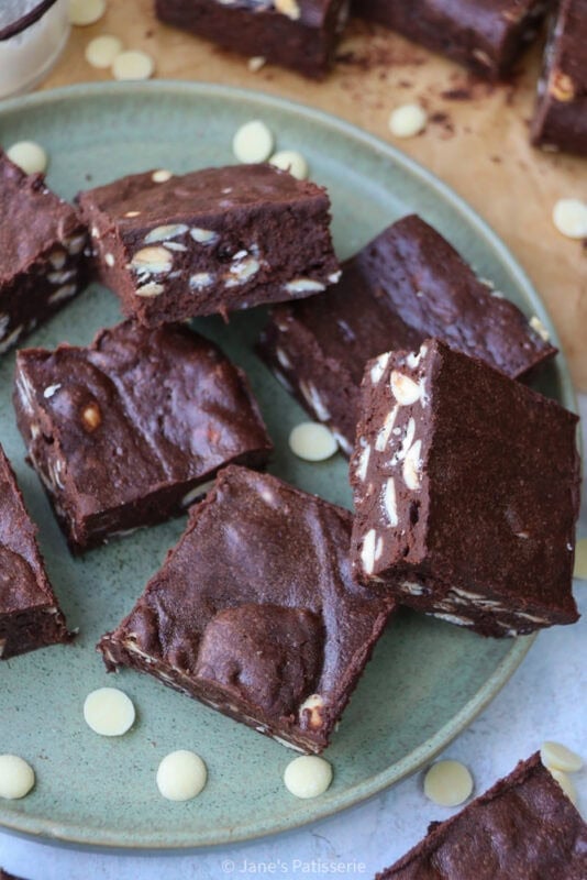 - Chocolate – I would always recommend using dark chocolate of at least 70% cocoa content in the brownies to make sure the base bakes properly. You can use any flavour chocolate chip to fold through at the tend (I used white)