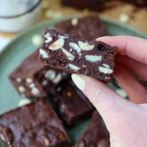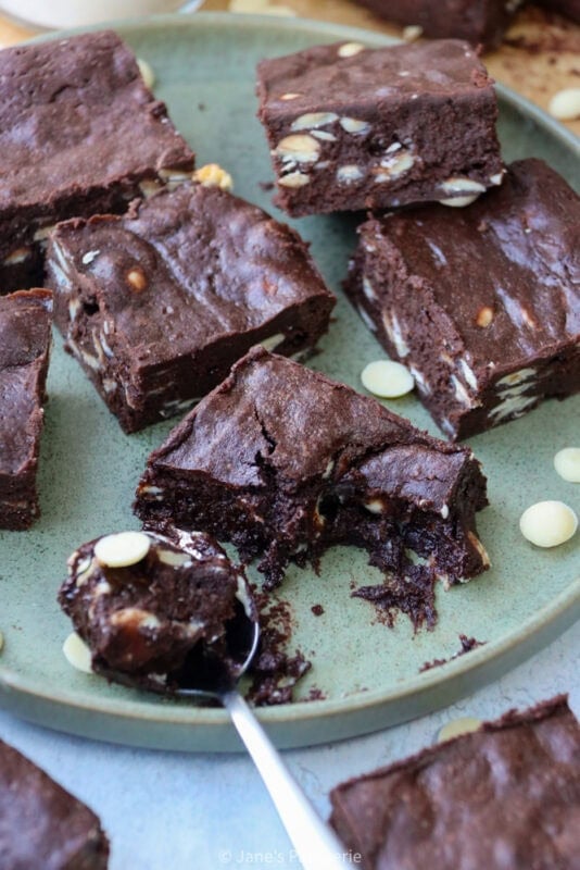I bake my brownies until there is a small wobble in the middle, but sometimes this can be hard to see. It’s best to let the brownies cool fully in a tin because this helps them set into shape, and then also setting in the fridge helps perfect that texture.