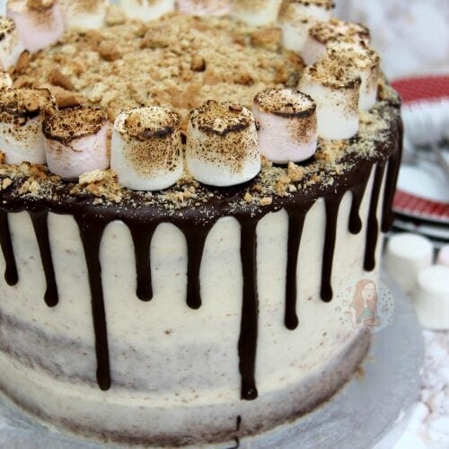 Chocolate Sponge, Marshmallow Fluff Buttercream Frosting, Toasted Marshmallows and Crushed Biscuits make the ultimate S’mores Cake to end all S’mores. Easy, Delicious, and Sweet…yum. I’ve been wanting to make a S’mores Cake for a good while now, but I knew I should wait till Autumn and Halloween/Guy Fawkes time to post it. Bonfire Night is…