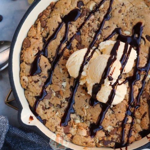 A triple chocolate giant skillet brownie – drizzled with chocolate, and topped with ice cream! When I posted my delicious recipe for my chocolate chip skillet cookie it’s been a massive hit ever since – how can anyone not love a GIANT cookie that you can devour for yourself?! So… why not try it as a brownie?!…