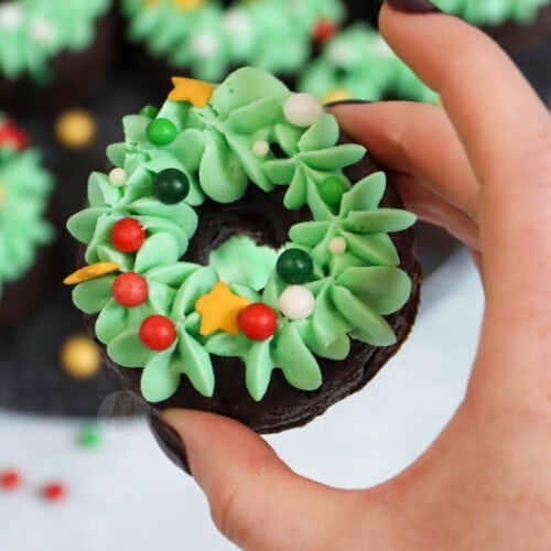 Delicious chocolate brownie doughnuts with chocolate chips, topped with green buttercream frosting and sprinkle baubles = christmas wreath bronuts! Say hello to the cutest little edible Christmas wreaths you fill find this festive season! They are sweet, super chocolatey, and yes, they are brownie doughnuts. HELLO!! Brownies So we all know and love my brownie…