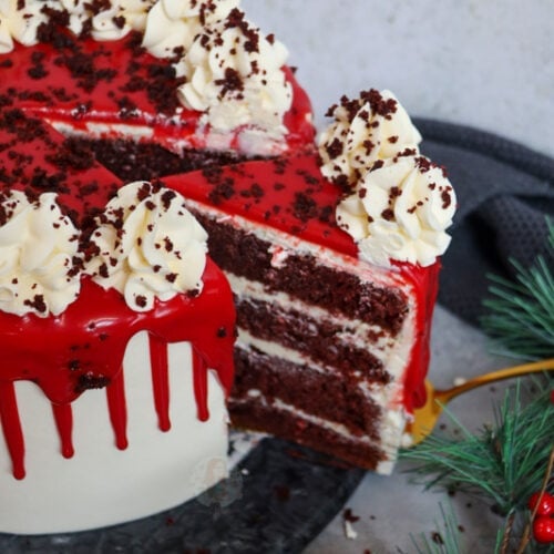A deliciously festive red velvet drip cake with four layers of sponge, delicious frosting, ganache, and more! This beauty of a recipe is designed to give you all the festive vibes with its white and red theme, delicious flavour, and beautiful decoration. I am obsessed with all things red velvet, and after so many requests…