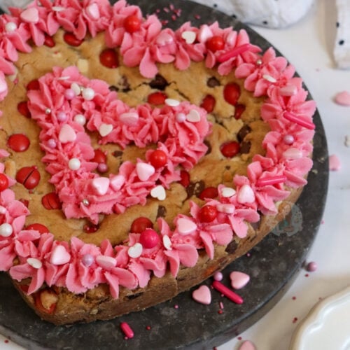 Giant chocolate chip Valentines cookie decorated with all things lovely and delicious… a giant Valentines cookie! SO, it’s nearly Valentines day, so I thought I’d post a delicious heart shaped chocolate chip stuffed giant valentines cookie that is perfect for the day, and I love it! White, milk and pink and red chocolates… topped with…