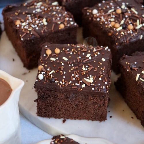 A deliciously yummy chocolate school cake with a really easy-to-make chocolate cake, icing, and homemade chocolate custard! Oh, helloooo, you utterly delicious recipe that I just cannot get enough of already. Honestly, this chocolate school cake is a little life-changing for me, because I am just obsessed and I would like to eat it all…
