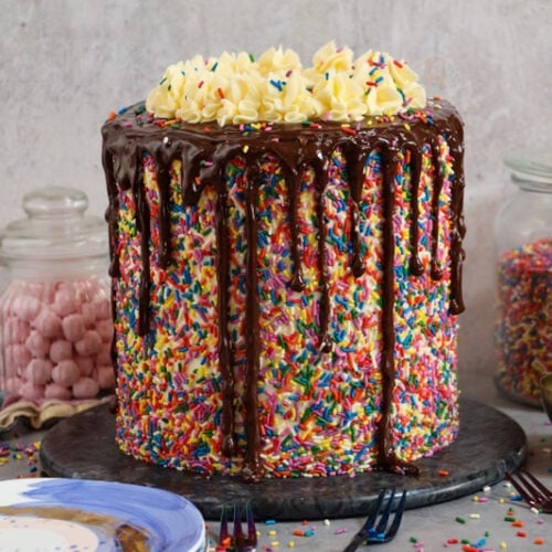 A four-layer chocolate cake with vanilla funfetti frosting and all of the chocolate drip for an amazing melted ice cream cake! We all remember the ice cream upside on a cake trend right?! Well, I am here ~several~ years later to bring it back because I love them still, and I am just obsessed with…