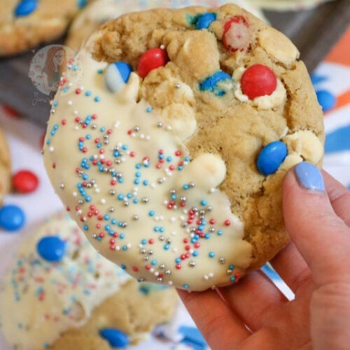 Delicious white chocolate and M&M NYC Cookies, with a red, white and blue theme for the Jubilee weekend… Jubilee cookies! Jubilee cookies! And here we are again with another Jubilee bake… this time, Jubilee cookies!! Yes I know I know, maybe a bit red white and blue for some, but that’s the whole point right?!…