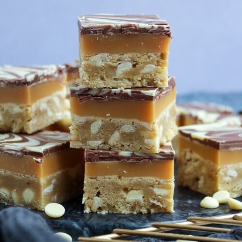 White chocolate chip blondies, homemade caramel, and swirled chocolate make the best millionaires blondies ever! When you add any form of traybake, caramel and chocolate, you can pretty much guarantee that I am going to want to bake it, eat it and be very happy – and these millionaires blondies are 100% at the top…